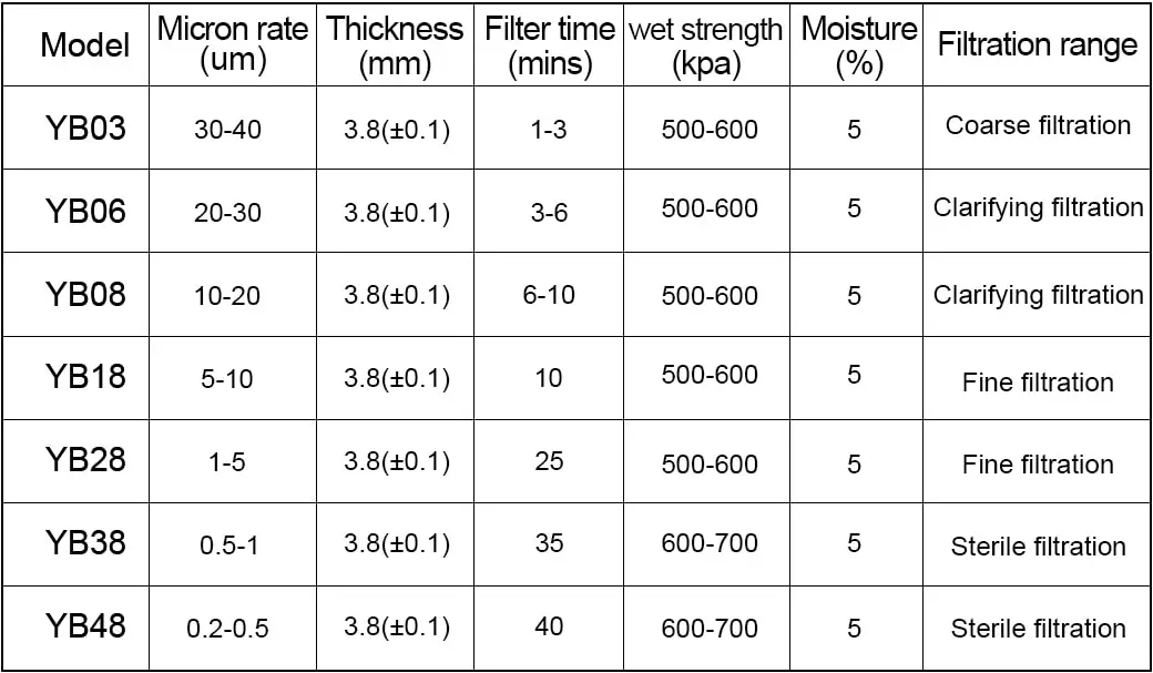 The YB series is developed for the beverage and food industry, offering a new, mineral-free depth filtration system suitable for a wide range of applications. This includes coarse filtration, fine filtration, super fine filtration, and sterile filtration. The filter paper sheet exhibits a high physical adsorption capacity, and its pore sizes can be fine enough to retain bacteria, thereby producing a sterile liquid. During the filtration process, solid particles are slowed down and eventually retained by the tortuous path inside the filter sheet and by electrokinetic interactions. This unique mechanism enables a long lifetime of the filter until plugging occurs. All materials used are food and pharmacy-grade and FDA approved.